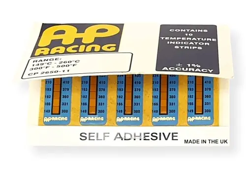 Naklejki do pomiaru temperatury na zaciskachProducent AP RacingZakres temperatury 149-260 stopni CDokładność +/- 1%Zestaw zawiera 10 sztuk pasków samoprzylepnychNaklejki pokazują wartość maksymalnej osiągniętej temperatury na obudowie zacisku (lub innego przedmiotu do którego są przyklejone). Po osiągnięciu danej temperatury odpowiednie pola zmieniają barwę.Wg zaleceń firmy AP Racing zaciski które pracują te temperaturze do 200°C powinny mieć wymienione uszczelnienie co drugą imprezę.Zaciski które pracują sporadycznie w temperaturach 200-220°C lub wyższej powinny mieć wymienione uszczelnienia najwcześniej jak jest to możliwePrzedmiotem oferty są tylko paski samoprzylepne, farby widoczne na zdjęciu nie wchodzą w skład oferty.