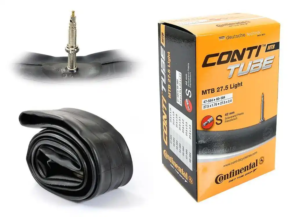 Dętka rowerowa Continental Conti-Tube Oferta dętek Continental ułatwia znalezienie tej jednej, właściwej dla Ciebie. Przyjazna dla użytkownika oferta odpowiada wielorakim rozmiarom, typom zaworów, ich długościom i konstrukcjom, jak również różnym rodzajom opon i stylom jazdy. Różnorodność dętek pozwala na właściwy wybór: dętka standardowa jest dostępna we wszystkich rozmiarach, oferuje najlepszy kompromis pomiędzy codzienną jazdą, a wagą, podczas gdy w wersjach Light i Supersonic największe znaczenie ma waga i opór toczenia. Każda dętka wyposażona jest również w nakrętkę redukcyjną/stabilizującą wentyl, która zapobiega zerwaniu wentyla podczas pompowania, poprawiając jednocześnie komfort pompowania. Można stabilizować wentyl w otworze 8 mm i 6 mm. Wentyle stosowane przez Continental posiadają specjalnie profilowaną nakrętkę stabilizującą wentyl w obręczy. Profilowanie nakrętki umożliwia również montaż wentyla w obręczach posiadających otwór o średnicy 8 mm (dedykowany dla wentyli samochodowych i dunlop). Wentyle presta pompujemy przy użyciu dokładnie takich samych pompek co wentyle dunlop (rowerowe). Dętka z serii LIGHT o cieńszych ściankach niż standardowe dętki. Dzięki temu uzyskano bardzo niską wagę produktu. Rozmiar Dętka pasuje do kół z oponami o rozmiarze w zakresie 27.5″ x 1.75″ – 2.4″ (47/60-584).W powyższym zakresie podana jest średnica kół do jakich dętka pasuje, to jest 27.5″ (ETRTO 584) oraz szerokość opon z jakimi jest kompatybilna: od 1.75″ do 2.4″ (ETRTO 47-60). Przykłady rozmiarów opon do których może zostać użyta:27.5″ x 1.75″ (47-584)27.5″ x 1.9″ (48-584)27.5″ x 2.0″ (50-584)27.5″ x 2.1″ (54-584)27.5″ x 2.2″ (55-584)27.5″ x 2.3″ (57-584)27.5″ x 2.4″ (60-584) Cechy produktu Producent: Continental Wentyl: presta o długości 42 mm. Średnica zewnętrzna zaworu: 6.5 mmNakrętka stabilizująca wentyl: tak, do otworów 6/8 mmWaga: ~ 148 g O systemie Unitube w dętkach Continental:Dętki wielorozmiarowe pasują do większej ilości rozmiarów opon niż tradycyjne dętki rowerowe.Wszystkie dętki są bezszwowe i wulkanizowane celem zapewnienia jednakowej okrągłości i zwiększonej niezawodności trzonu wentyla.Każdy egzemplarz przechodzi bardzo rygorystyczną kontrolę jakości.