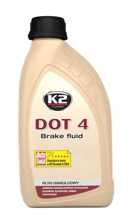 Opis produktu i zastosowanieK2 DOT 4 to w pełni syntetyczny najwyższej jakości płyn hamulcowy stosowany w układach hamulcowych i sprzęgłowych samochodów bardzo mocno obciążonych. Polecany przez profesjonalne warsztaty samochodowe.Płyn hamulcowy DOT 4 posiada doskonałe parametry reologiczne pozwalające na stosowanie w bardzo niskich temperaturach. Jest neutralny dla uszczelnień i stopów metali stosowanych w układzie hamulcowym oraz chroni go przed korozją. Płyn hamulcowy K2 DOT 4 posiada temperaturę wrzenia przekraczającą 230 st. C, dzięki czemu dłużej zachowuje on swoje właściwości. Produkt jest w pełni  mieszalny z innymi płynami klasy DOT. K2 DOT 4 jest dedykowany do samochodów z systemami ABS, ESP, ASR, SBC. Spełnia wymagania normy obowiązującej w Polsce PN-C-40005:2002, a także norm amerykańskich FMVSS 116 DOT4, SAE J 1703, SAEJ 1704, ISO4925, Class 4, FMVSS 116.Posiada Certyfikat Zgodności Instytutu Transportu Samochodowego w Warszawie. Płyn hamulcowy K2 DOT 4 przeznaczony jest do wymiany we wszystkich typach samochodów, gdzie instrukcja obsługi nakazuje stosowanie płynu DOT 4 lub DOT 3.Zaleca się wymianę co 2 lata lub co 40 tys. kilometrów przebiegu.