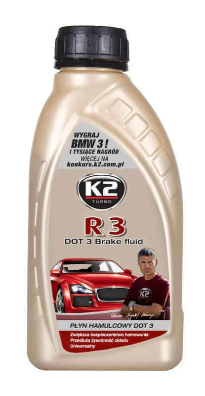 Opis produktu i zastosowanieK2 R3 to w pełni syntetyczny najwyższej jakości płyn hamulcowy o temperaturze wrzenia pow. 240 st. C. Płyn hamulcowy R3 stosowany jest w samochodowych układach hamulcowych. Jest przeznaczony do wymiany i uzupełnienia płynu we wszystkich pojazdach, gdzie instrukcja obsługi nakazuje stosowanie płynu R3 lub DOT3.K2 R3 jest w pełni mieszalny z innymi płynami klasy R3 lub DOT3. W starszych samochodach zastępuje dotychczas stosowany płyn R3, dzięki czemu znacznie poprawia bezpieczeństwo eksploatacji samochodu.posiada wysoką stabilność chemiczną, doskonałe własności reologiczne w niskich i wysokich temperaturach. Jest neutralny dla uszczelnień i stopów metali stosowanych w układach hamulcowych.Płyn hamulcowy R3 spełnia wymagania wszelkich norm obowiązujących w Polsce PN-C/40005 oraz ITS znak B a także norm amerykańskich No 116 DOT3, ISO 4925, SAE J 1173. Zaleca się wymianę co 2 lata lub co 40 tys. kilometrów przebiegu.