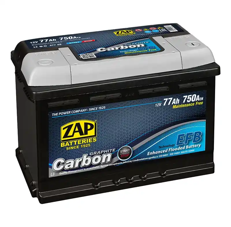 W odpowiedzi na dynamicznie zmieniające się warunki rynkowe orazwzrost oczekiwań kierowców wzakresie parametrów technicznych akumulatorów, Dział Konstrukcyjno-Technologiczny grupy ZAP Sznajder Batterien S.A. opracował nową linię akumulatorów START-STOP Carbon EFB. Akumulatory START-STOP Carbon EFB są przeznaczone przede wszystkim do pojazdów zsystemem START-STOP. Doskonale sprawdzają się również wzwykłych autach jako akumulatory klasy premium. Ich bezawaryjną pracę, wysoką trwałość orazdoskonałe parametry elektryczne osiągnięto wwyniku zastosowania grubszych elektrod wykonanych wtechnologii 3Dx, wdrożeniu innowacyjnej metody sezonowania materiałów elektrodowych orazzastosowaniu nowoczesnych dodatków węglowych. Cechy wyróżniające grupę akumulatorów START-STOP Carbon EFB: przestrzenna konstrukcja (3Dx) nośników materiałów elektrodowych wysoka odporność korozyjna uzyskana dzięki zastosowaniu specjalnej obróbki plastycznej taśmy ołowiowej, tj.: 6-krotne walcowanie + 7-my stopień kalibracji doskonała zdolność przyjmowania ładunku wwyniku zastosowania dodatków węglowych dużo lepsze parametry użytkowe wzakresie częściowego naładowania igłębokiego rozładowania wporównaniu ztradycyjnymi akumulatorami kwasowo-ołowiowymi wydłużona trwałość cykliczna dzięki innowacyjnej technologii sezonowania poprawiającej adhezyjność materiałów elektrodowych zwiększona zdolność rozruchowa. Parametry: Pojemność: 77Ah Prąd rozruchowy: 750A Polaryzacja: Prawy + Długość: 276 Szerokość: 175 Wysokość: 190 Kod producenta: 577 05