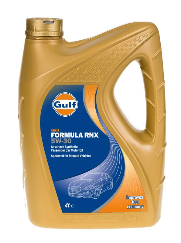 Opis produktu i zastosowanieGulf Formula RNX 5W 30 jest syntetycznym, kompatybilnym z nowoczesnymi systemami katalitycznymi olejem do silników samochodowych, zaprojektowanym z użyciem nowoczesnego, niskopopiołowego (low SAPS) pakietu dodatków, spełniającym normy Euro 4. Gulf Formula RNX 5W 30 jest specjalnie formułowany do smarowania w warunkach wysokiego ścinania i temperatury (HTHS>3.5mPa.s) silników benzynowych i diesla wyposażonych w filtry cząstek stałych (DPF) i trójdrożny katalizator (TWC), tak aby wydłużyć znacząco żywotność tych układów oczyszczania spalin. Gulf Formula RNX 5W 30 zapewnia doskonałą ochronę przeciwzużyciową i minimalizację odkładania się osadów w silniku i turbosprężarce. Olej został wyprodukowany w technologii, która pozwala przewyższyć wymagania stawiane przez najnowsze modele aut Renault i innych producentów wymagających zalania silnika olejem spełniającym normę ACEA C4.