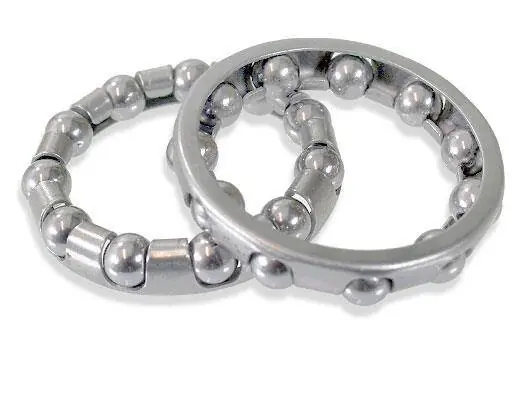 Łożysko kulkowe (wianek) KKT-11, 1/4″x11 Koszyk (tzw. wianek) wraz z kulkami wykonany z wysokiej jakości stali.Koszyk kulek typu zatrzaskowego. Łożysko stosowane między innymi w piastach typu torpedo (stare Romety). Cechy produktu Ilość kulek: 11Średnica kulki: 1/4 cala, czyli ~6,35 mmŚrednica wewnętrzna wianka/koszyka: ~30 mmŚrednica zewnętrzna wianka/koszyka: ~40 mm Główne zadania koszyka są następujące: – Oddzielenie elementów tocznych w celu zmniejszenia momentu tarcia i ograniczenia ilości ciepła powstającego w łożysku w wyniku tarcia.- Utrzymywanie równomiernego rozkładu elementów tocznych na całym obwodzie w celu zapewnienia optymalnego rozkładu obciążenia i cichej, równomiernej pracy łożyska.- Prowadzenie elementów tocznych w strefie nieobciążonej w celu poprawy warunków toczenia i zapobiegania występowania poślizgów mających szkodliwy wpływ na trwałość łożyska.- Utrzymywanie elementów tocznych w łożyskach rozłącznych, gdy jeden z pierścieni jest zdejmowany podczas montażu lub demontażu. Cena dotyczy jednego wianka łożysk.