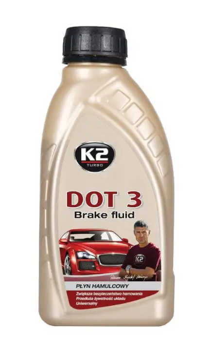 Opis produktu i zastosowanieK2 DOT 3 jest to nowoczesny płyn hamulcowy stosowany w układach hamulcowych i sprzęgłowych. Temperatura wrzenia płynu hamulcowego DOT 3 znacznie przekracza wymagalną normami temperaturę 205 C. Zapewnia doskonałą ochronę przed korozją i zabezpiecza elementy gumowe. Wydłuża żywotność układu hamulcowego.Produkt mieszalny i zamienny z płynami hamulcowymi klasy DOT i R3. Posiada znak bezpieczeństwa „B” oraz certyfikat zgodności wydany przez Instytut Transportu Samochodowego w Warszawie. K2 DOT 3 Spełnia wymagania normy obowiązującej w Polsce PN-C-40005:2002, a także norm amerykańskich FMVSS 116 , DOT3, SAE J 1703. Płyn hamulcowy K2 DOT 3 przeznaczony jest do wymiany we wszystkich typach samochodów, gdzie instrukcja obsługi nakazuje stosowanie płynu DOT 3 lub R3. Zaleca się wymianę co 2 lata lub co 40 tys. kilometrów przebiegu.