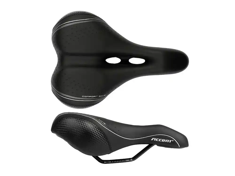 Siodełko rowerowe Accent Zone Lady, damskie, żelowe, miejskie, turystyczne Komfortowe siodełko damskie Accent ZONE Lady.Przeznaczone do jazdy miejskiej i turystycznej.Wypełnione grubą warstwą żelu, która absorbuje drgania.W części centralnej otwór.Pokryte skórą syntetyczną koloru czarnego.Mocowanie na stalowe pręty. Cechy produktu Producent: AccentModel: Zone LadyWypełnienie: żelMocowanie: prętyAmortyzacja: poduszki elastomeroweWymiary: 240 mm x 180 mmKolor: czarnyWaga: ~450 g
