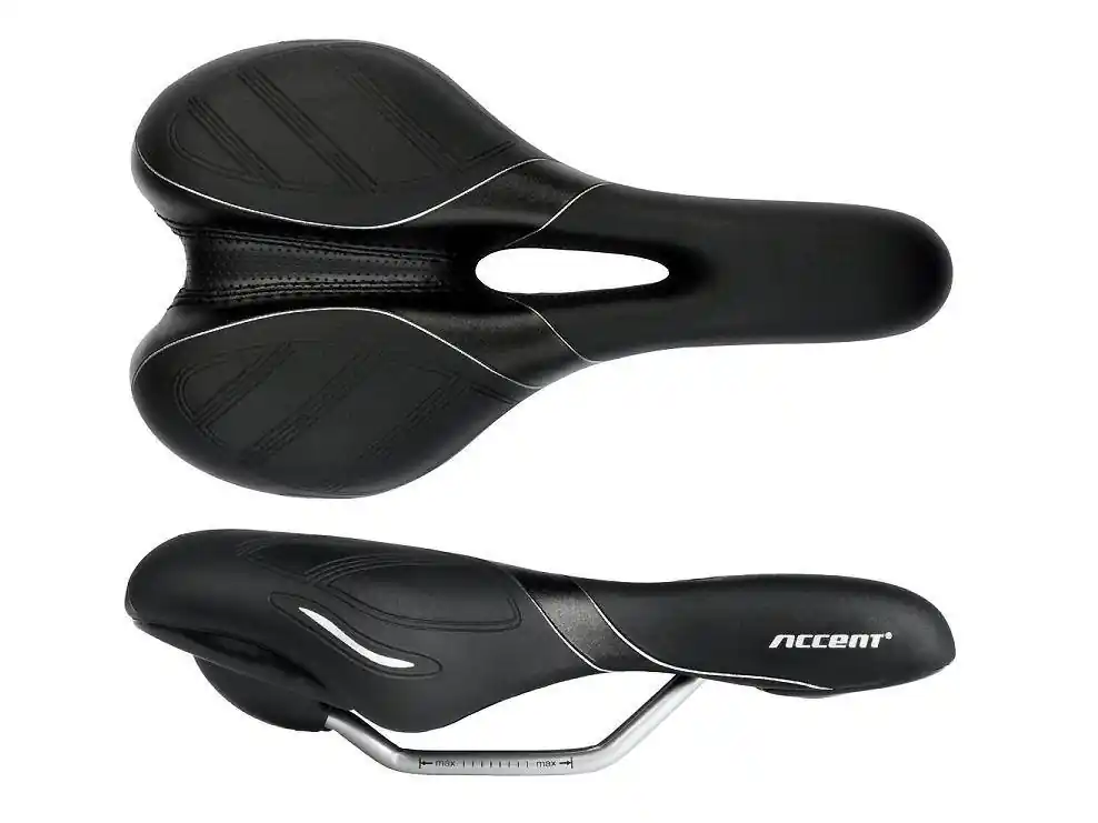 Siodełko Accent Derry męskie Wygodne siodełko męskie do jazdy sportowej. Ergonomiczny kształt. Otwór w części centralnej. Wypełnienie z pianki o wysokiej gęstości. Pokrycie ze skóry syntetycznej. Stalowe pręty. Cechy produktu Długość: 272 mm Szerokość: 152 mmKolor: czarnyŚrednia waga:~ 345 g