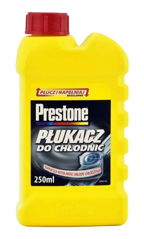 Opis produktu i zastosowaniePreparat do płukania chłodnic Prestone Super Radiator Flush skutecznie i szybko czyści cały układ chłodzenia. Usuwa rdzę, kamień, zanieczyszczenia olejowe oraz inne osady powstające w układzie chłodzenia. Doskonale czyści pompę wody oraz termostat.Prestone Super Radiator Flush przywraca wydajność układu chłodzenia. Zapobiega przegrzewaniu i uszkodzeniu silnika. Przeznaczony do stosowania we wszystkich typach samochodów i chłodnic. Zawiera inhibitory korozji. Jest nietoksyczny i nie zawiera kwasów. Bezpieczny dla aluminium i gumy.
