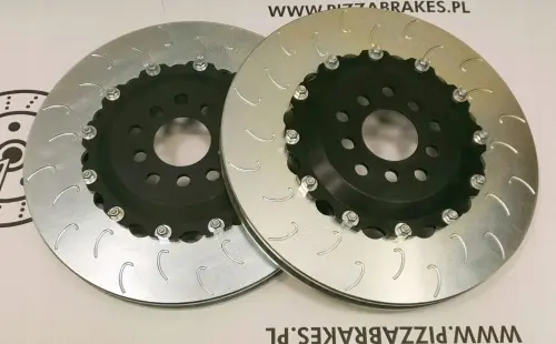 Tarcze pływające 370x32mm Leon Cupra 5F Audi TT RS Zestaw tarcz hamulcowych dwuczęściowych polskiej produkcji PIZZABRAKES. Tarcze sportowe o podwyższonej jakości i odporności. Tarcze cynkowane, odporne na korozję i wysokie temperatury. Tarcze w wersji nacinanej cechuje poprawiona skuteczność odprowadzania gazów, lepsze chłodzenie hamulców oraz zapobiega tzw. szkleniu się klocka hamulcowego.Tarcze 2-częsciowe są sportowym zamiennikiem dla tarcz seryjnych jednoczęsciowych. W porównaniu do 1-częściowych cechują się lepszym odprowadzaniem ciepła oraz niższą wagą. Po zużyciu tarczy wymienia się jedynie rotor – bez dzwonów. Wszystkie tarcze hamulcowe są zabezpieczone antykorozyjnie warstwą cynku nadając im charakterystyczny kolor. Tarcze dwuczęściowe pływające na systemie AP RACING Tarcze są zamiennikiem oryginalnych tarcz 370x32mm z grupy VAG (Audi Seat Skoda Volkswagen) jednak dzięki dodatkowemu rozstawowi 5×100 można je wykorzystać także do innych samochodów. Montowane fabrycznie w Audi TT RS 8J oraz w samochodach SEAT z Performance pack (zaciski brembo i tarcze 370mm). Tarcze są bezpośrednim zamiennikiem, pasują bez żadnych modyfikacji! Parametry: średnica 370mm Grubość Grubość max/min: 32/30mm Otwór centrujący: 65mm Wysokość: 49,8mm Rozstaw: 5×112 / 5×100 Waga: 9,81kg Tarcze pływające pozwalają na swobodne rozszerzanie się materiału pod wpływem wysokich temperatur tym samym redukując naprężenia i możliwości pękania tarcz hamulcowych TARCZE NACINANE Podana cena jest za komplet tarcz na przednią oś gotowych do montażu (2 sztuki, skręcone, rotory, śruby, nakrętki, podkładki i dzwony). Istnieje także możliwość zamówienia tych tarcz skręconych na sztywno śrubami AP Racing – w tej sprawie prosimy o kontakt. Pełna lista referencji: Tarcze 370mm występowały jako opcja salonowa pakietu performance dostępna do większości modeli marki SEAT. Były też fabrycznie montowane w samochodach Audi TT RS typ 8J W celu sprawdzenia czy te tarcze będą pasowały do Państwa samochodu prosimy o kontakt. Można je też dopasować także do innych modeli ponieważ zastosowaliśmy dodatkowy rozstaw śrub 5×100 (np skoda octavia I) Pasuje do pojazdów: Audi TT (8J3) 2.5 RS quattro (CEPA) 2480ccm 340KM/250kW 2009/07-2014/06 TT (8J3) 2.5 RS quattro (CEPB) 2480ccm 360KM/265kW 2011/05-2014/06 TT Roadster (8J9) 2.5 RS quattro (CEPA) 2480ccm 340KM/250kW 2009/07-2014/06 TT Roadster (8J9) 2.5 RS quattro (CEPB) 2480ccm 360KM/265kW 2012/03-2014/06 Seat LEON (5F1) 2.0 Cupra (CJXA) 1984ccm 280KM/206kW 2013/10- LEON (5F1) 2.0 Cupra (CJXC) 1984ccm 300KM/221kW 2017/01- LEON (5F1) 2.0 Cupra (CJXE) 1984ccm 265KM/195kW 2013/10- LEON (5F1) 2.0 Cupra (CJXH DNUC) 1984ccm 290KM/213kW 2015/10- Przed zakupem prosimy o kontakt w celu odpowiedniego dobrania tarcz do Państwa samochodu oraz w celu sprawdzenia czasu realizacji.