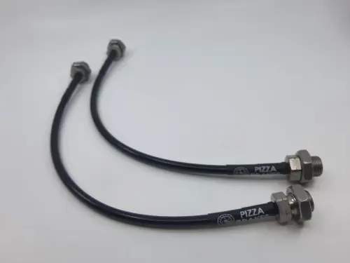 Przewody w stalowym oplocie.Kolor czarny.Długość całkowita przewodu z końcówkami: 38,5 cm.Z obu stron końcówki „żeńskie”. Gwint 10×1.Stożek uniwersalny.Produkt jest nowy – nieodebrane zamówienie przez klienta.Cena dotyczy kompletu, dwóch przewodów.Przewody mogą posiadać defekty wizualne, nie wpływające na bezpieczeństwo użytkowania.