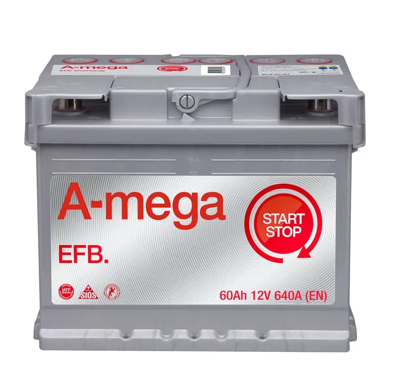 AMEGA EFB START&STOP 12V 60Ah 640A PARAMETRY: – Wymiary: 242x175x190 (dł x szer x wys) – Pojemność C20: 60Ah – Prąd Rozruchu: 640A (EN) – Typ obudowy: L2 – Typ wieczka: Duplex – Dolne mocowanie: B13 – Układ ogniw: 0 (P+) – Rodzaj biegunów: 1 – Waga: ~17,2kg