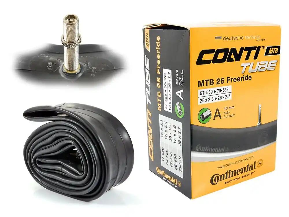 Dętka rowerowa Continental Conti-Tube Oferta dętek Continental ułatwia znalezienie tej jednej, właściwej dla Ciebie. Przyjazna dla użytkownika oferta odpowiada wielorakim rozmiarom, typom zaworów, ich długościom i konstrukcjom, jak również różnym rodzajom opon i stylom jazdy. Różnorodność dętek pozwala na właściwy wybór: dętka standardowa jest dostępna we wszystkich rozmiarach, oferuje najlepszy kompromis pomiędzy codzienną jazdą, a wagą, podczas gdy w wersjach Light i Supersonic największe znaczenie ma waga i opór toczenia. Każda dętka wyposażona jest również w nakrętkę stabilizującą wentyl, która zapobiega zerwaniu wentyla podczas pompowania, poprawiając jednocześnie komfort pompowania. Rozmiar Dętka pasuje do kół z oponami o rozmiarze w zakresie 26″ x 2.3″ – 2.7″ (57/70-559).W powyższym zakresie podana jest średnica kół do jakich dętka pasuje, to jest 26″ (ETRTO 559) oraz szerkość opon z jakimi jest kompatybilna: od 2.3″ do 2.7″ (ETRTO 57-70). Przykłady rozmiarów opon do których może zostać użyta:26″ x 2.3″ (57-559)26″ x 2.4″ (60-559)26″ x 2.5″ (62-559)26″ x 2.6″ (65-559)26″ x 2.7″ (70-559) Cechy produktu Producent: ContinentalWentyl: auto (samochodowy) o długości 40 mm.Średnica zewnętrzna zaworu: 8 mmNakrętka stabilizująca wentyl: takWaga: ~ 300 g Dętki wielorozmiarowe pasują do większej ilości rozmiarów opon niż tradycyjne dętki rowerowe.Wszystkie dętki są bezszwowe i wulkanizowane celem zapewnienia jednakowej okrągłości i zwiększonej niezawodności trzonu wentyla.Każdy egzemplarz przechodzi bardzo rygorystyczną kontrolę jakości.