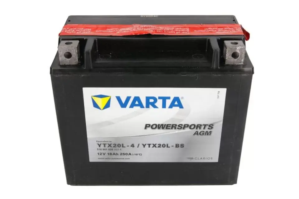 VARTA YTX20L-BS AGM 18AH 250A L+ ️Dane techniczne: Napięcie nominalne (V):12 Pojemność (Ah):18 Prąd rozruchu (EN):250 Wymiary dł. x sz. x wys. (mm):177 x 88 x 156 Typ mocowania:B00, Układ połączeń:0 Bieguny:Y4, Typ:AGM Odporność na wstrząsy (EN):V3,
