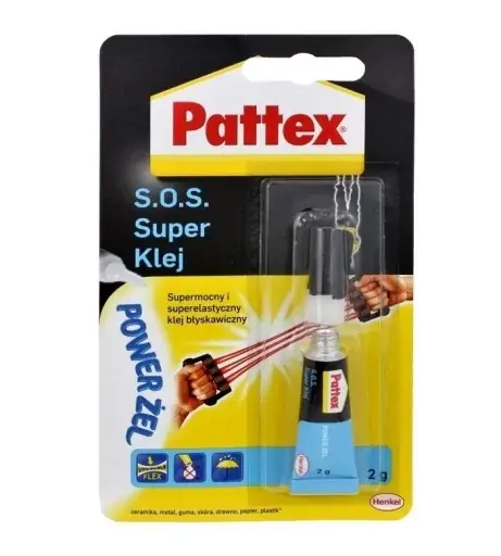 Supermocny isuperelastyczny klej błyskawiczny ! Pattex S.O.S. Super Klej Power Żel jest supermocnym isuperelastycznym klejem cyjanoakrylowym ouniwersalnym zastosowaniu. Dzięki żelowej konsystencji klej niekapie imożna go stosować na pionowych powierzchniach. Idealnie nadaje się do materiałów ipołączeń narażonych na zginanie. Dzięki zastosowaniu specjalnej formuły połączenie jest trwale elastyczne orazniewidoczne. Znajduje zastosowanie zarówno do klejenia materiałów porowatych jak inieporowatych, takich jak: drewno, tektura, korek, papier, guma, metal, ceramika, porcelana, skóra, tkaniny, plastik iwiększość tworzyw sztucznych. Zalety kleju: Supermocny Superelastyczny Odporny na wstrząsy inaprężenia, do materiałów ipołączeń narażonych na zginanie Wodoodporny – do użycia również na zewnątrz Możliwość dopasowania klejonych powierzchni Nie kapie, nierozlewa się ijest łatwy wdozowaniu Nadaje się do prac na płaszczyznach pionowych, do klejenia większych powierzchni ichłonnych materiałów
