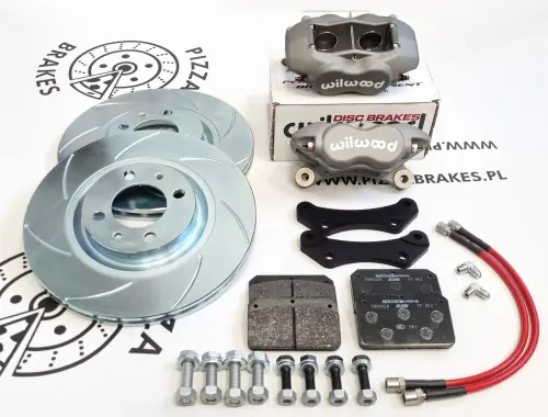 Zestaw hamulcowy big brake bmw e30 zaciski wilwood tarcze 284mmZestaw hamulcowy big brake kit do bmw e30 – wszystkie modele poza M3.Ten zestaw opracowany jest do lekkiego sportu / szybkiej jazdy.Zestaw wchodzi pod większość felg w rozmiarze 15 cali jednak nie każda felga zmieści zacisk 4 tłoczkowy.Niestety felgi MIM z et13 mają taką konstrukcję że zaciski nie wchodzą bez dystansów. Seryjne felgi BBS z ET24 pasują bez problemów.W skład zestawu wchodzą:Zaciski Wilwood 4 tłoczkowe, z kutego aluminium, z wewnętrznymi kanałami, tłoczki bez uszczelnień zewnętrznych.Tarcze 1 częściowe nacinane 284x22mmJarzmo wykonane z aluminium 7075 anodowane Klocki hamulcowe Ferodo DS2500śruby montażowe wraz z podkładkamiDo zestawu dołączymy także pasujące do zacisków przewody hamulcowe w stalowym oplocie w wybranym kolorzePodana cena jest za kompletny zestaw na przednią oś gotowy do montażu na samochodzie.Zestaw ma przeznaczenie do szybkich samochodów cywilnych które czasem odwiedzą tor. Klocki nadają się do użytku miejskiego i torowego. Zachowujemy seryjny balans siły hamowania. Nie zwiększamy wagi układu mimo zastosowania większych tarcz i lepszych zacisków.Zaciski ważą 1.45kg sztuka – seryjne około 3kgśrednica tłoczków jest dokładnie taka sama jak w seryjnym układzie więc zachowujemy oryginalny balans siły hamowania przód – tył.Tarcze nacinane mają wymiar 284x22mm (seryjne 260mm).Klocki hamulcowe Ferodo DS2500 to idealny kompromis pomiędzy jazdą cywilną i używaniem auta na torze. Wytrzymują do 500 stopni jednocześnie działając od pierwszego hamowania. Dodatkową zaletą w tym modelu klocka hamulcowego jest jego wyjątkowo niska cena.Waga całego zestawu na przednią oś to 17.5kg, porównywalna do układu seryjnego przy jednoczesnym zwiększeniu rozmiaru tarczy aż o 24mm.Pasuje do pojazdów:BMW3 (E30) 1982/09-1983/08 323 i 139KM/102kW 333 (E30) 1982/09-1987/08 318 i 105KM/77kW 233 (E30) 1982/09-1987/12 316 90KM/66kW 61453 (E30) 1982/09-1991/12 315 75KM/55kW 61463 (E30) 1983/09-1989/11 325 i 171KM/126kW 393 (E30) 1982/09-1991/12 320 i 125KM/92kW 303 (E30) 1983/09-1986/08 323 i 150KM/110kW 343 (E30) 1983/09-1990/12 316 (Ecotronic) 90KM/66kW 203 (E30) 1983/10-1988/12 325 e 2.7 122KM/90kW 403 (E30) 1984/12-1988/08 318 i 102KM/75kW 223 (E30) 1985/01-1987/08 325 e 2.7 129KM/95kW 413 (E30) 1985/09-1991/08 324 d 86KM/63kW 423 (E30) 1985/12-1991/06 320 i 129KM/95kW 293 (E30) 1986/03-1987/12 325 i X 171KM/126kW 383 (E30) 1986/12-1991/06 325 i 170KM/125kW 373 (E30) 1986/12-1991/08 325 i X 170KM/125kW 363 (E30) 1987/08-1988/08 316 i 102KM/75kW 61473 (E30) 1987/09-1991/06 316 i 100KM/73kW 213 (E30) 1987/09-1991/06 318 i 113KM/83kW 273 (E30) 1987/09-1991/06 318 i 115KM/85kW 243 (E30) 1987/09-1991/08 324 td 115KM/85kW 433 (E30) 1988/07-1991/06 316 i 102KM/75kW 46513 (E30) 1989/09-1991/08 318 is 136KM/100kW 283 Touring (E30) 1987/07-1993/03 325 i 170KM/125kW 463 Touring (E30) 1987/09-1991/06 318 i 115KM/85kW 147953 Touring (E30) 1988/01-1991/12 320 i 129KM/95kW 453 Touring (E30) 1988/01-1993/06 324 td 115KM/85kW 483 Touring (E30) 1991/09-1994/06 316 i 102KM/75kW 144033 Touring (E30) 1988/06-1993/10 325 i X 170KM/125kW 473 Touring (E30) 1989/04-1994/06 318 i 113KM/83kW 443 Touring (E30) 1991/09-1994/06 316 i 100KM/73kW 2193 kabriolet (E30) 1985/12-1987/12 325 i 171KM/126kW 3013 kabriolet (E30) 1986/04-1993/10 320 i 129KM/95kW 2993 kabriolet (E30) 1987/09-1989/12 316 i Baur TC 99KM/73kW 1213373 kabriolet (E30) 1987/09-1993/10 325 i 170KM/125kW 3003 kabriolet (E30) 1990/09-1993/10 318 i 113KM/83kW 298Przed zakupem prosimy o kontakt w celu odpowiedniego dobrania zestawu do Państwa samochodu oraz w celu sprawdzenia czasu realizacji.