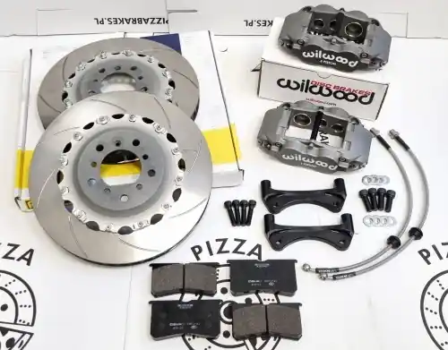 Zestaw hamulcowy BMW M3 E46 na zaciskach Wilwood 6-tłok i tarczach AP Racing 356x32mm Zestaw zaprojektowany pod felgi 18″. Powinien też wejść pod niektóre sportowe 17″ np felgi PROTRACK Prezentujemy zestaw hamulcowy Big Brake Kit naszej konstrukcji oparty na zaciskach Wilwood 6 tłoczkowych, oraz tarczach pływających 356x32mm AP Racing. Jest to wersja opracowana z myślą o sporcie – zawody jak wyścigi, time attack, rajdy.W tym komplecie połączyliśmy skuteczne i odporne zaciski Wilwooda ze świetną jakością tarcz AP. Tarcze są lekkie i bardzo sprawnie odprowadzają ciepło z układu. Do zestawu dołączone są klocki Ferodo DS UNO o grubości 20mm.W skład zestawu wchodzą:Zaciski Wilwood 6-tłoczkowe (sześciotłoczkowe), z kutego aluminium. Z wewnętrznymi kanałami. Tłoczki ze stali nierdzewnej, bez uszczelnień zewnętrznych. Twarda anoda typu IIIRotory 2-częściowe z firmy AP Racing 356x32mm nacinane. 48 kierunkowych kanałów chłodzących.System pływający (float in the bell) z firmy AP RacingDzwony do tarcz z aluminium 7075 anodowaneJarzmo wykonane z aluminium 7075 anodowaneKlocki hamulcowe Ferodo DS UNO o grubości 20mmśruby montażowe wraz z podkładkamiPrzewody hamulcowe w stalowym oplocie w wybranym kolorze dostosowane do nowych zaciskówPodana cena jest za kompletny zestaw na przednią oś gotowy do montażu na samochodzieCharakterystyka zestawuZaciski 6 tłoczkowe z kutego aluminium charakteryzują się wysoką sztywnością co bezpośrednio wpływa na reakcję na nacisk pedału hamulca.Tłoczki ze stali nierdzewnej mają dziesięciokrotnie mniejszy wsp. przewodzenia ciepła od aluminiowych (w cywilnych zaciskach np brembo tłoczki są aluminiowe) zdecydowaniej ograniczając temperaturę przedostającą się do płynu hamulcowego.Pod tłoczkami hamulcowymi znajdują się sprężyny dociskowe, dzięki czemu nie ma zjawiska odsuwania się klocków hamulcowych od tarczy (tzw knockback)Tarcze dwuczęściowe cechują się lepszym chłodzeniem i niską wagą. Rozmiar tarcz to 356x32mm. Jedna kompletna tarcza waży 7.3kgSystem pływający AP Racing zapewnia ruch pomiędzy tarczą, a dzwonem montażowym redukując naprężenia jakie powstają podczas rozszerzania się materiału rotorów w bardzo wysokich temperaturach. Zastosowany system jest typu float in the bell.Polecamy także nasz zestaw na tył do tego modelu oparty na zaciskach Wilwood czterotłoczkowych. Przy takiej konfiguracji na przód i na tył stosujemy identyczny model klocka co obniża koszty i ułatwia serwisowanie.Klocki hamulcowe Ferodo DS UNO są najlepszym wyborem pod kątem wytrzymałości na temperatury, zużycia oraz współczynnika tarcia. Klocki działają od zera do ponad 750 stopni zachowując pełną stabilność i współczynnik tarcia ponad 0.5 w całym zakresie pracy.Zestaw przygotowany jest pod kątem wykorzystania w sporcie samochodowym. Zaciski są typowo wyczynowe. Nie posiadają osłon przeciwkurzowych. Konstrukcja tych zacisków sprawia, że każde zastosowane klocki będą głośno piszczały podczas lekkich hamowań.Zestaw nie ma homologacji do poruszania się nim po ulicach i nie zalecamy takiego rozwiązania.