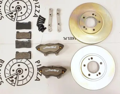 Zestaw hamulcowy Lancer Evo 10 TYŁ 296x30mm budgetZestaw hamulcowy na tylną oś opracowany do samochodu Mitsubishi Lancer Evo 10 oraz proto budowanych na EVO X. Zestaw jest opracowany pod rajdy szutrowe i asfaltowe i wchodzi pod felgi 15 cali. Zestaw ma zbliżone parametry z homologacją VO dla Evo X w wersji asfaltowej i szutrowej (średnica tłoczków jest taka sama jak w VO, tarcze mają lekko inne wymiary zamiast 295×25.4 jest 296x30mm). Testowane spasowanie na felgach Braid Compomotive Arcasting.W skład zestawu wchodzą:Zaciski Wilwood 4 tłoczkowe, z kutego aluminium, z wewnętrznymi kanałami, tłoczki ze stali nierdzewnej bez uszczelnień zewnętrznychTarcze 1 częściowe 296x30mm gładkie – bez bębnów – kasują seryjny hamulec ręcznyMamy w ofercie tarcze zamienne dwuczęściowe o tych samych paremetrach.Jarzmo wykonane z aluminium 7075 anodowane na kolor białyKlocki hamulcowe Mintex M1155 (lub inne do wyboru)śruby montażowe klasy 12.9Podana cena jest za kompletny zestaw na tylną oś gotowy do montażu na samochodziePrzed zakupem prosimy o kontakt w celu odpowiedniego dobrania zestawu do Państwa samochodu oraz w celu sprawdzenia czasu realizacji.